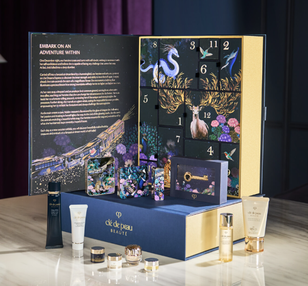 Clé de Peau Beauté 呈獻 Dreams Express Advent Calendar 星璨夢航限量聖誕倒數日曆 。禮盒與法國藝術家 Mr. Stéphane Kiehl 攜手合作,內含5款皇牌正裝產品及6款旅行裝護膚品 。正裝產品包括三款節日限定彩妝:柔亮唇膏、亮膚光映粉及四色眼影組合,更附有限量星璨鑰匙吊飾 。
