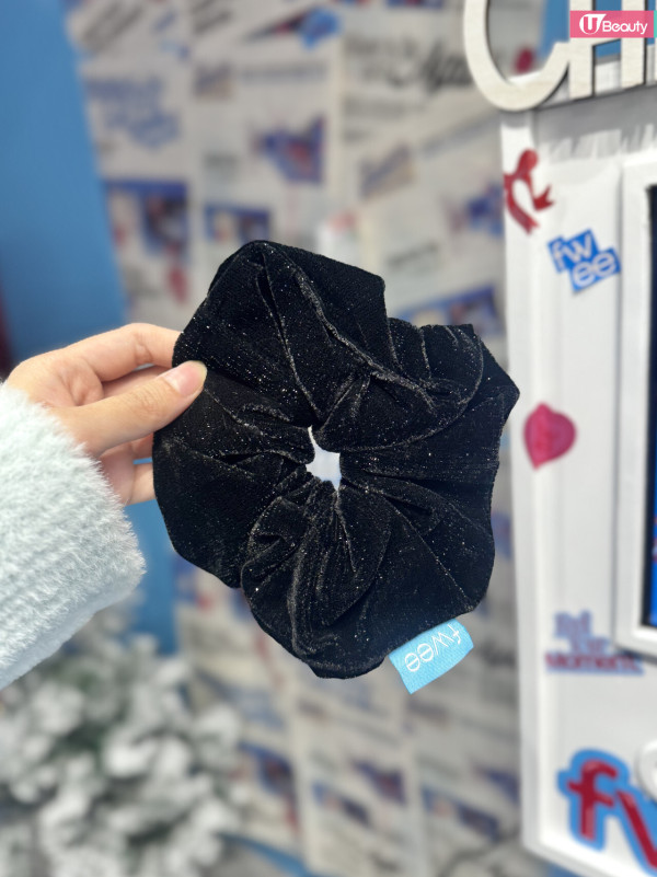 實物開箱: 編輯現場實測,髮圈是黑色絲絨質地,上面帶有微閃的亮片細節,配上 fwee 標誌性的藍色小標籤,質感非常好,綁高馬尾或戴在手上做飾物都超韓!重點是 無需任何消費 即可獲得,送完即止。