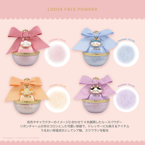 這款蜜粉絕對是整個系列中最吸睛的顏值 No.1 單品。圓潤的粉盒設計,蓋上飾有與角色代表色一致的巨型蝴蝶結,中央還懸掛著閃亮亮的Chiikawa 角色金屬吊飾。擺在化妝台上簡直就像歐洲宮廷裡的精緻擺設。系列提供了四款不同的色調,包括粉紅、粉藍、裸膚和薰衣草紫,可以根據個人膚色需要選擇適合的顏色進行校色和提亮,而且粉質標榜超級細膩,定妝效果輕盈。每款售價為日圓 2,750 (約港元$138)。