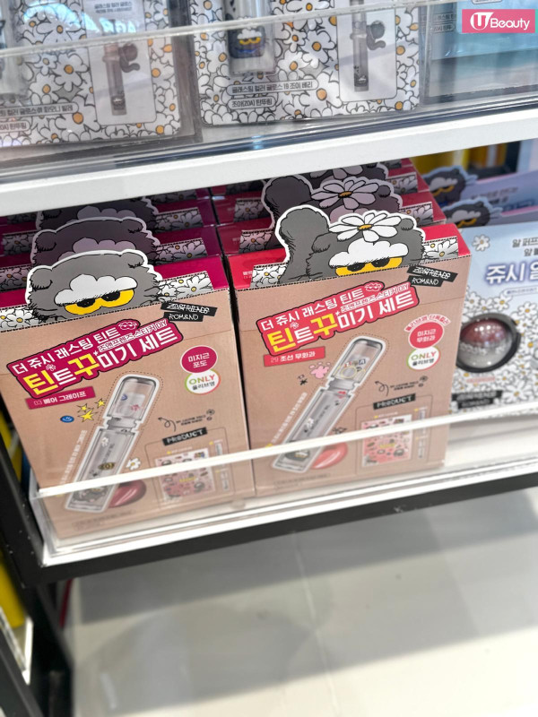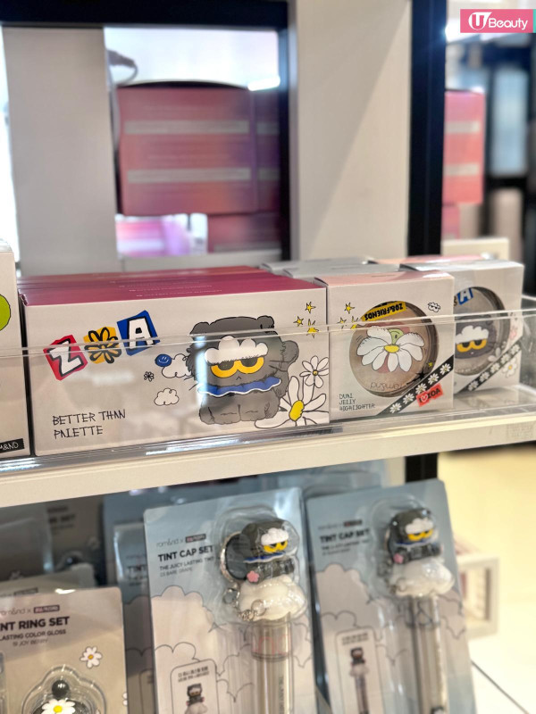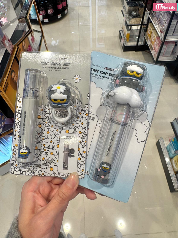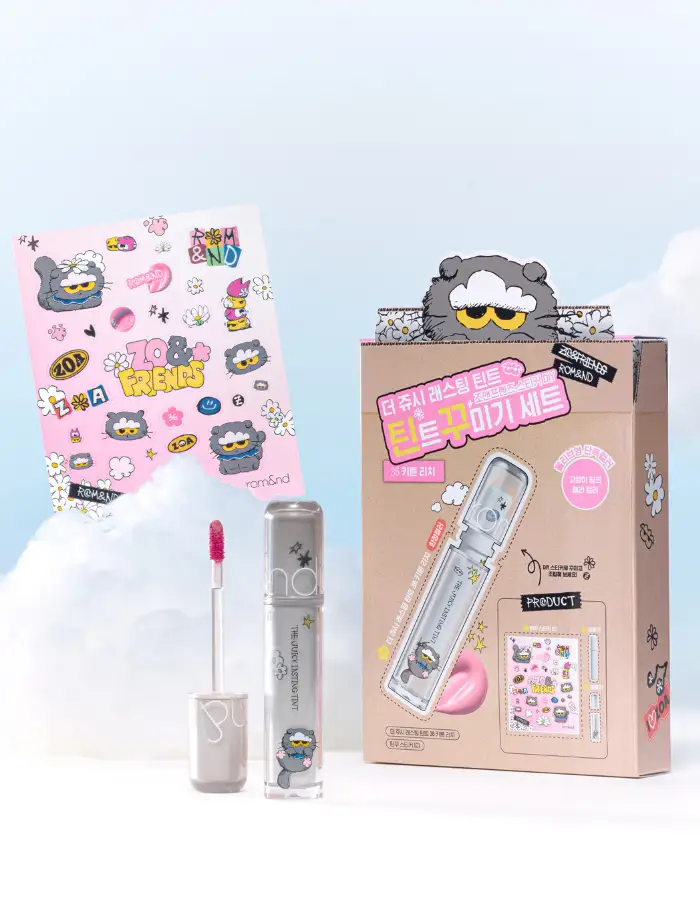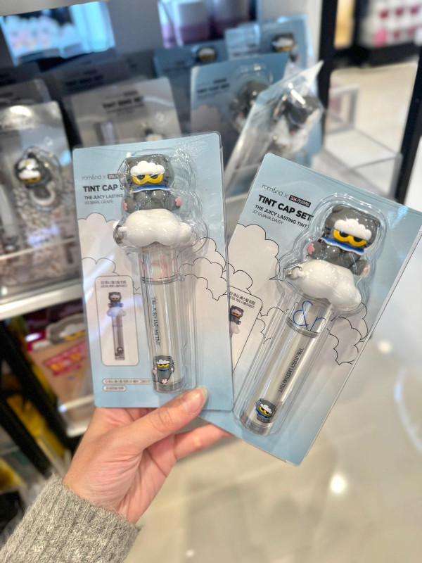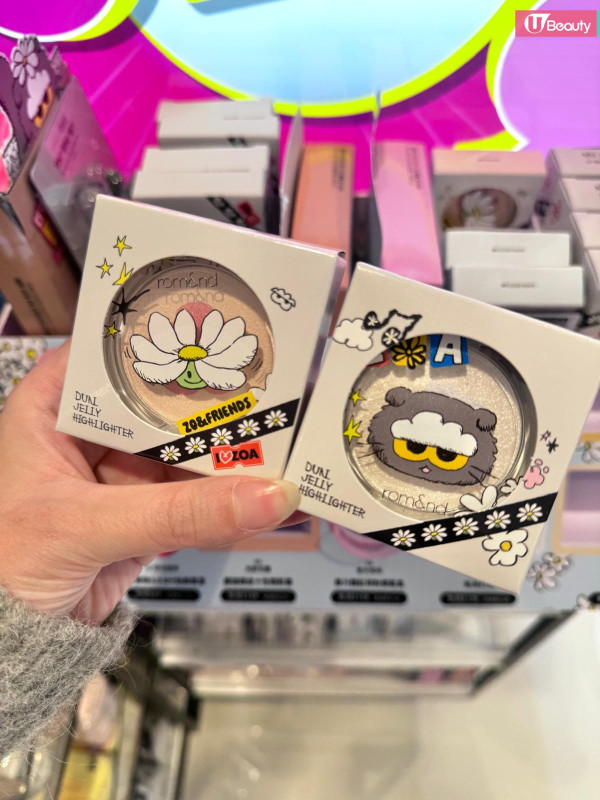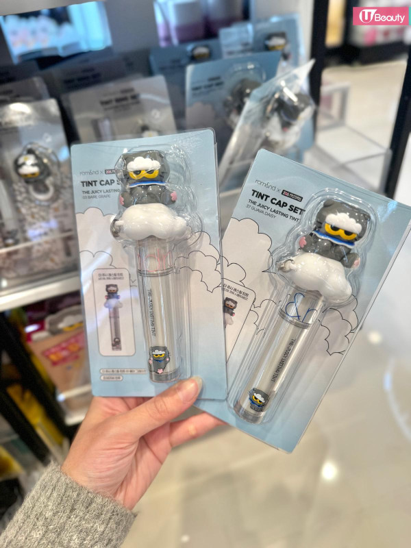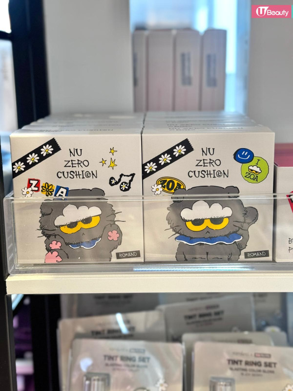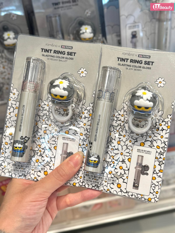這絕對是本次聯名的「斷貨王」!rom&nd 皇牌的 Glasting Color Gloss (天使光糖漿唇蜜) 與 Juicy Lasting Tint (果汁唇釉) 換上灰色貓貓包裝,最犯規的是隨盒附送一個 Zoa 立體公仔戒指/蓋帽!你可以把它套在唇釉蓋上,補妝時那隻貓就趴在上面看著你,或者拿下來當戒指戴,可愛指數爆燈!