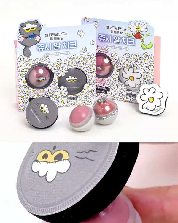 這款腮紅超特別!不是粉餅狀,而是一顆顆像糖果般的「腮紅球」,能刷出果汁般透亮氣色。重點是附送的粉撲也是貓貓和雛菊造型,軟綿綿超好摸。