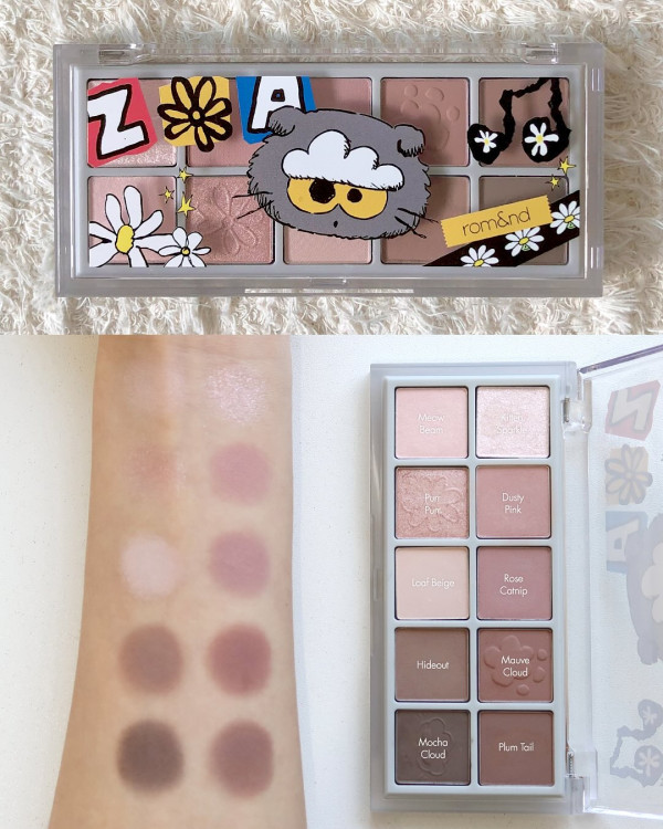 日常百搭的大地裸粉色系,眼影粉體上精緻地壓印了 Zoa 和貓掌圖案,美到捨不得用!低飽和度配色對新手非常友好,消腫一流。