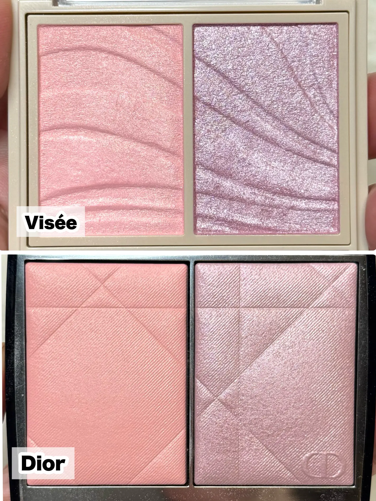 Dior 這盒傲姿胭脂修容組合 #287 Dioramour,主打一邊是柔霧粉色胭脂,另一邊是淡紫色的細緻光影粉,疊加使用,能打造出充滿透明感的「天生好氣色」。 而 Visée 這款花漾亮澤雙色胭脂,同樣主打「立體」與「光澤感」。一邊是帶有珠光的提亮色,另一邊是顯氣色的胭脂色,兩者疊加後,產生白裡透紅的自然透亮妝感,與 Dior #287 有近 90% 相似,效果相當驚人!兩者更相差超過 HK$400!