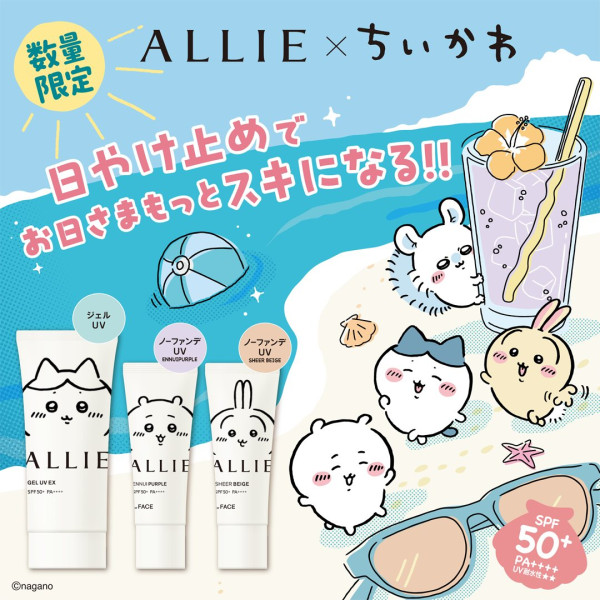 夏天將至,陽光變得猛烈,大家準備好防曬了嗎?日本開架防曬品牌 ALLIE 竟然與 Chiikawa 推出聯名系列!除了在產品上印著 Chiikawa、小八與兔兔的可愛表情外,就連包裝盒都精緻到讓人捨不得丟掉!全系列包含三款明星單品,針對不同膚質與需求而設,重點是具備 SPF50+ PA++++ 的超強防護力,防水抗磨擦,去沙灘玩水也不怕曬黑!