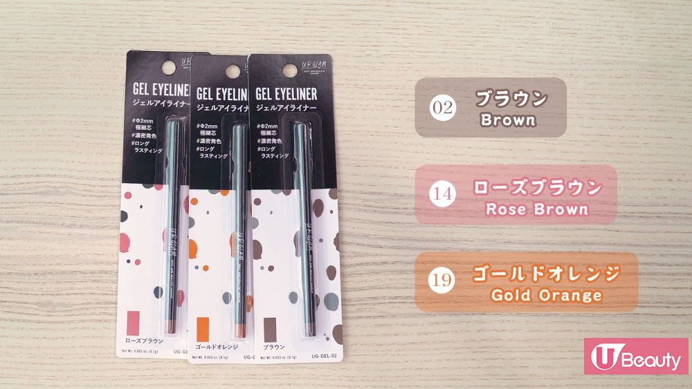 揀選眼線筆最看重的一定是其防水、抗暈染2大功能,尤其在香港的潮濕天氣下,眼線很容易脫妝溶掉,變成熊貓眼就尷尬了!一向是「油眼剋星」的啫喱眼線筆,在防水測試中得到極好的表現,而抗暈染也在合格線上,甚至可能是我用過眾多品牌中表現最好的一支!而且顏色選擇多,官網顯示有多達19隻色,而在香港Daiso Japan店則找到6-8隻色,全都是今年大熱色系——玫瑰啡、橙金色等。另外,液體眼線筆表現就較不穩定,黑色那款的防水能力不合格,用水就可以輕易卸掉,而啡色雖然十分防水,但用難以卸乾淨。