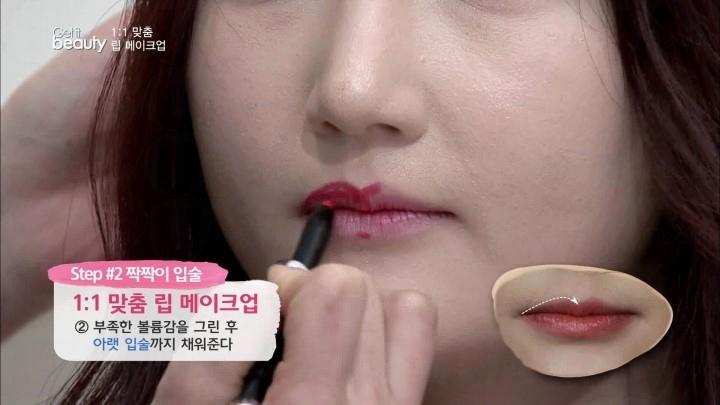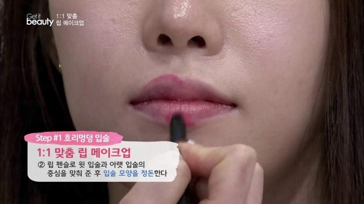 Step2 : 用唇膏筆重新描繪唇的輪廓,以上、下唇1:1的比例自行畫出唇峰。