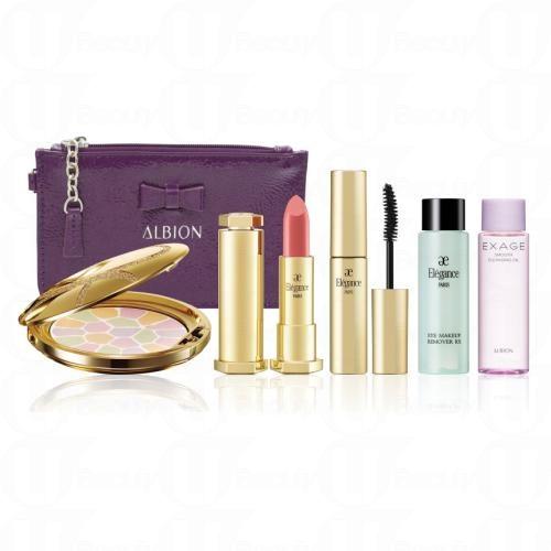 套裝包括:極緻定妝蜜粉餅(精巧盒裝版) 8.8g + 盈潤光彩唇膏 4g + 濃翹睫毛膏 4.5g + 輕柔眼部卸妝液 20ml+ 清新水潤柔滑卸妝油 21ml + ALBION 精美錢包1個