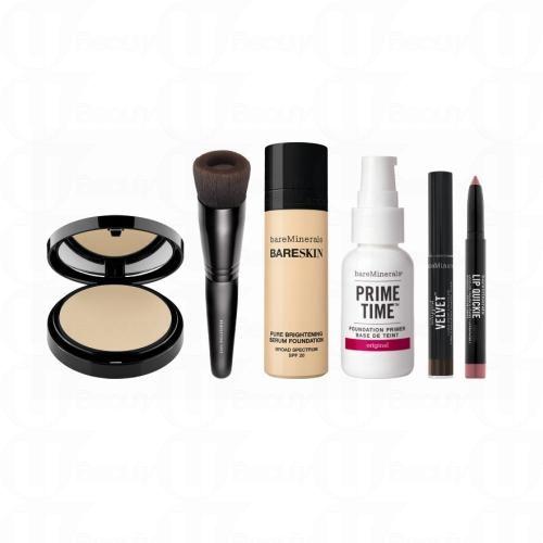 套裝包括:妝前底霜 30ml + 礦物水亮面膜粉底 30ml+ 完美面部化妝掃 + 礦物水亮面膜定妝粉餅 9g + 礦物絲絨唇膏筆 0.45g + 礦物絲絨眼影 4g