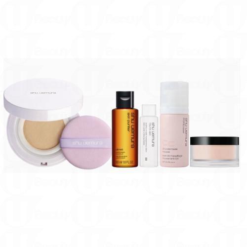 套裝包括:Tokyo-Smart智慧透亮氣墊粉底 + ultime8黃金琥珀潔顏油 50ml + TSUYA光感新肌精華水III 15ml + POREraser CC泡沫底霜杏色 20g + 白瓷光感蜜粉 2g