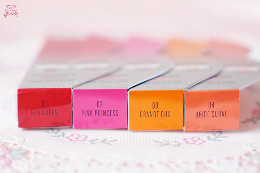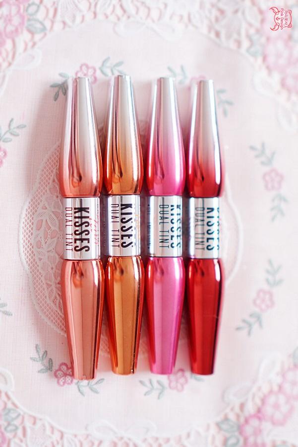 Two Kisses Dual Tint備有4種色調:分別是#01 霸氣艷紅(red queen)、#02 少女粉紅 (pink princess)、#03 夢幻之橘 (orange chu) 及 #04 迷人珊瑚 (bride coral)。