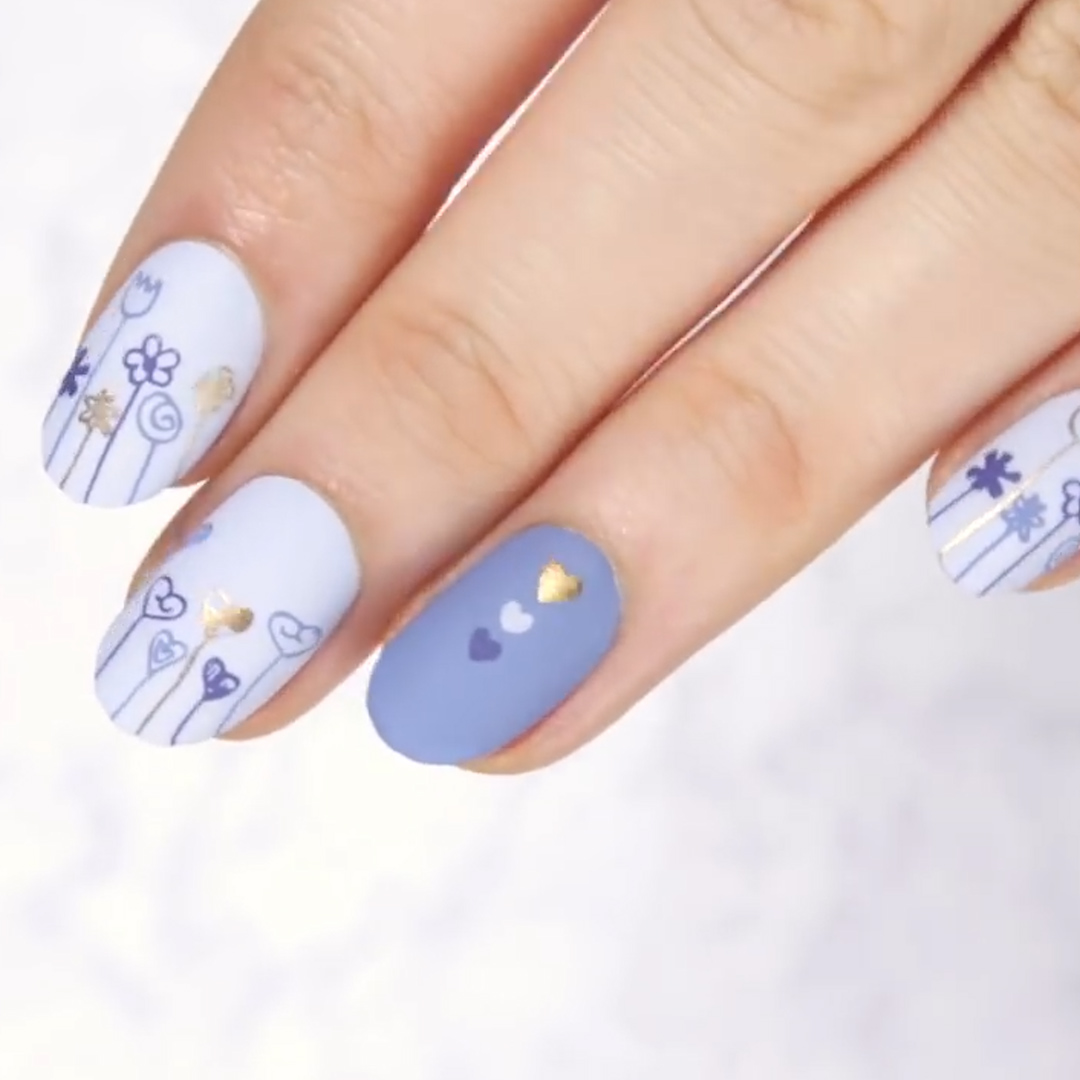 分別使用淺色和深色甲油印上心形,然後塗上霧面指甲油。