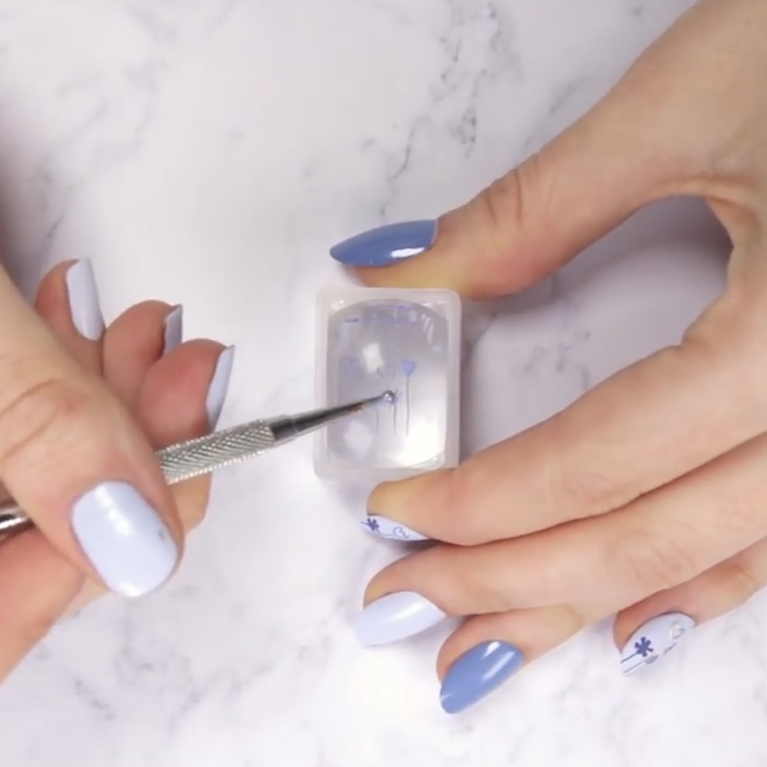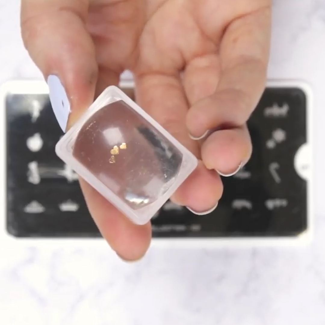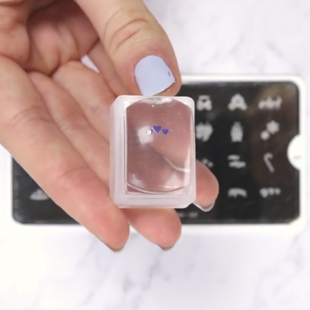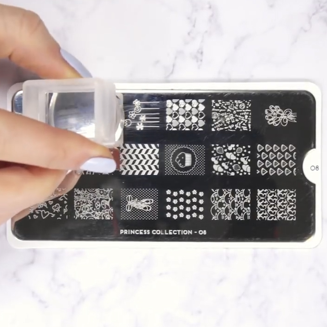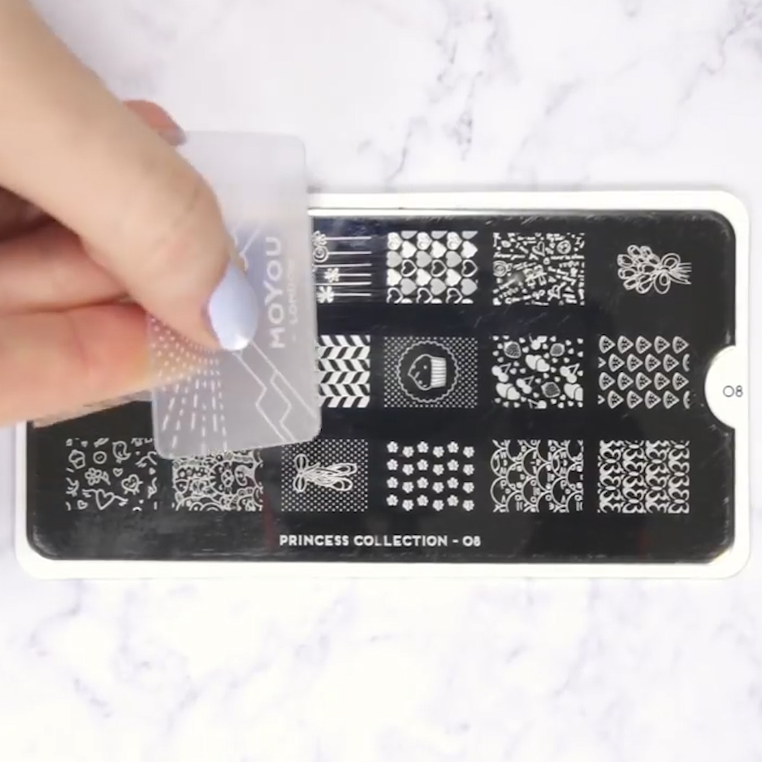 使用壓花板 。在壓花板上塗上指甲油,並用刮板刮掉多餘的甲油。