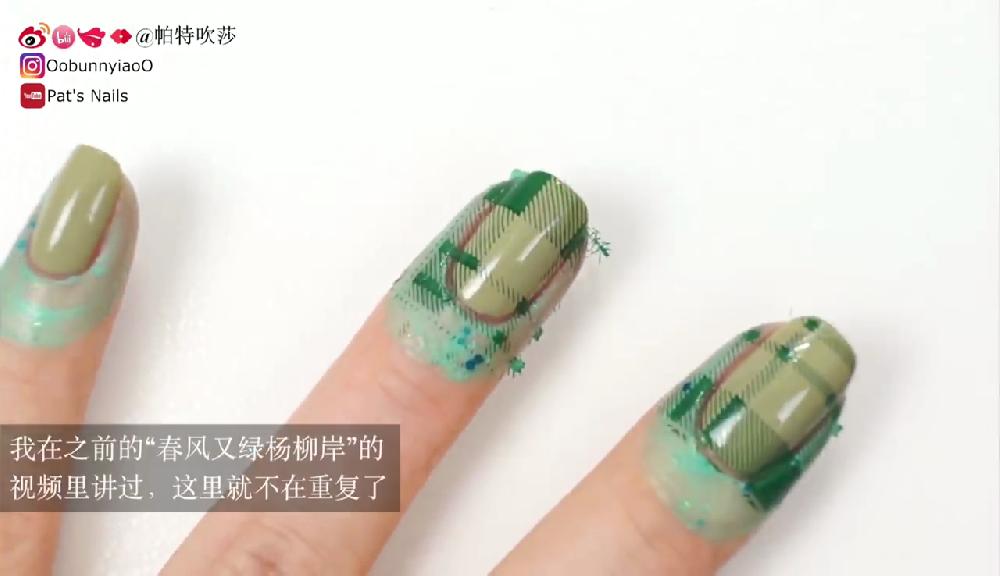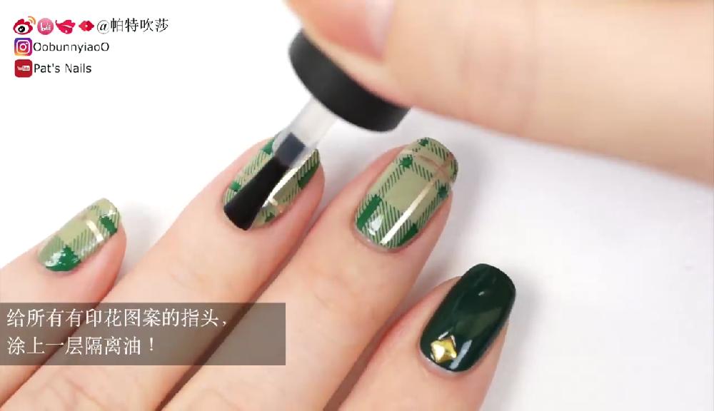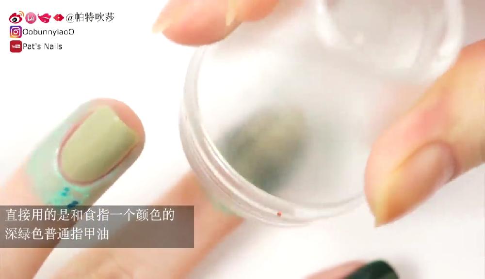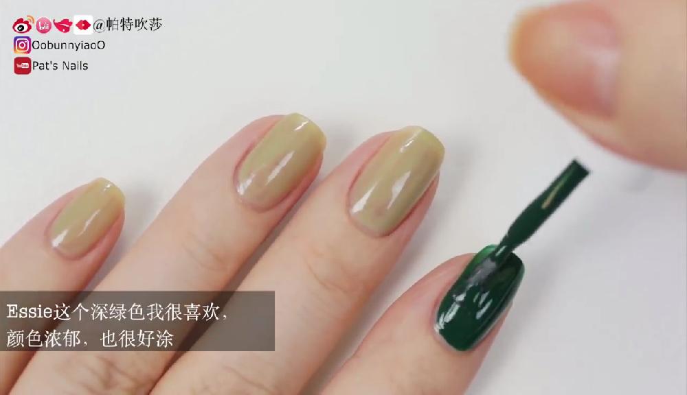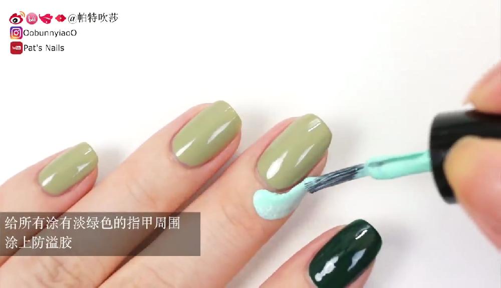塗上透明底油。待乾後塗上淺綠色和墨綠色指甲油,然後在指甲邊緣塗上甲油防溢膠。