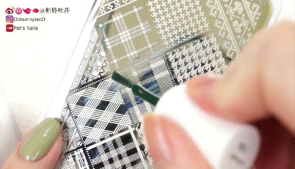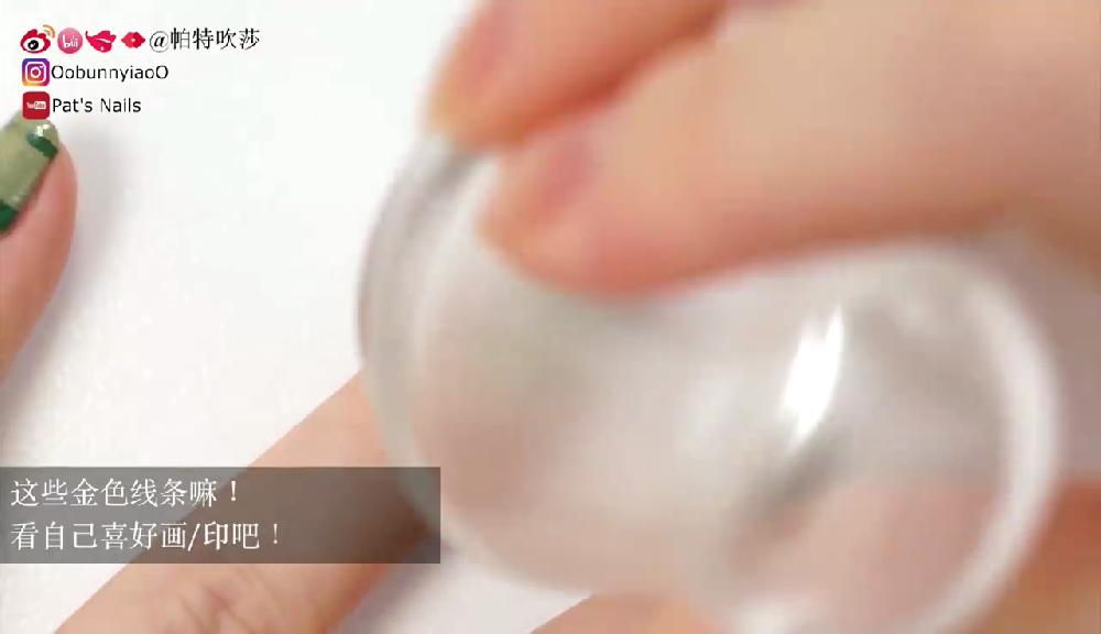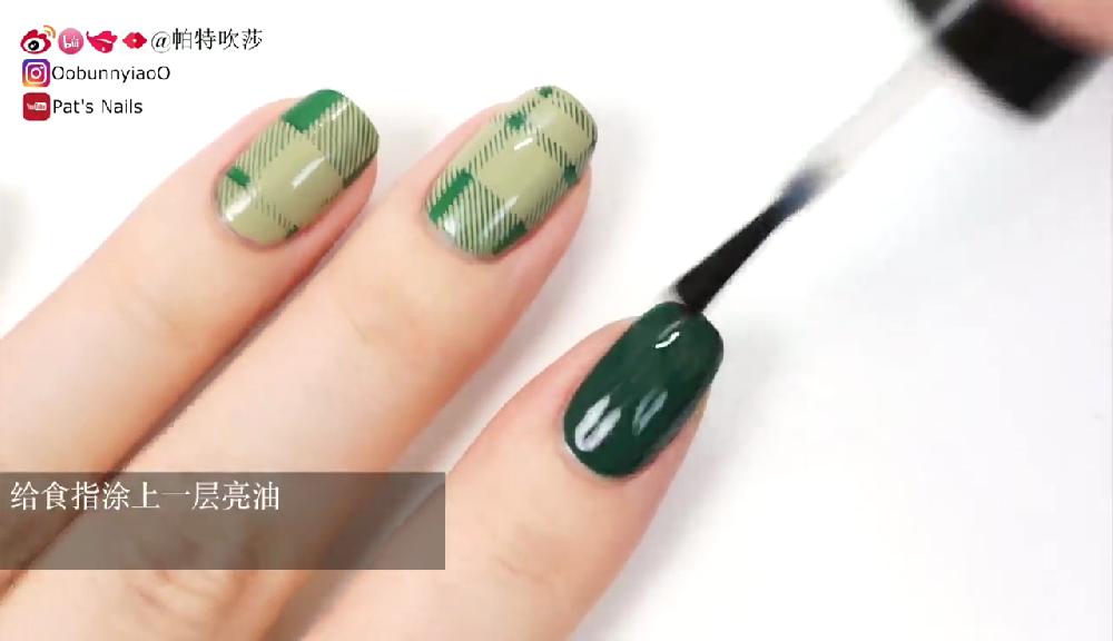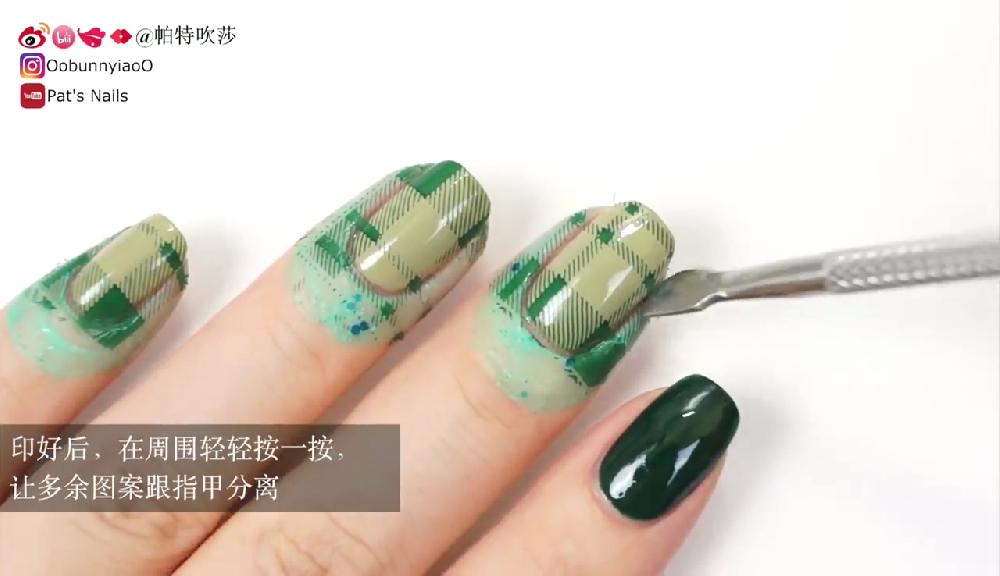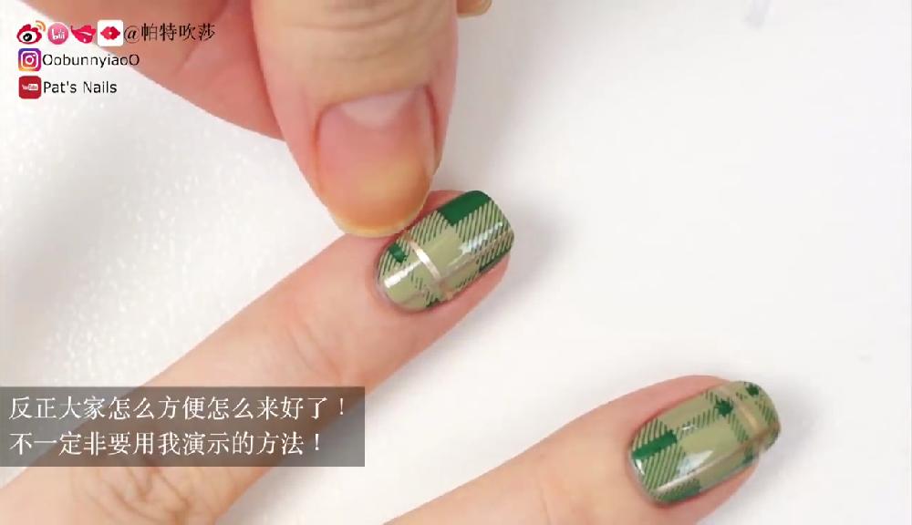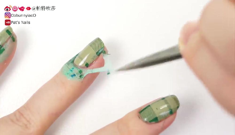 塗上透明底油。待乾後塗上淺綠色和墨綠色指甲油,然後在指甲邊緣塗上甲油防溢膠。