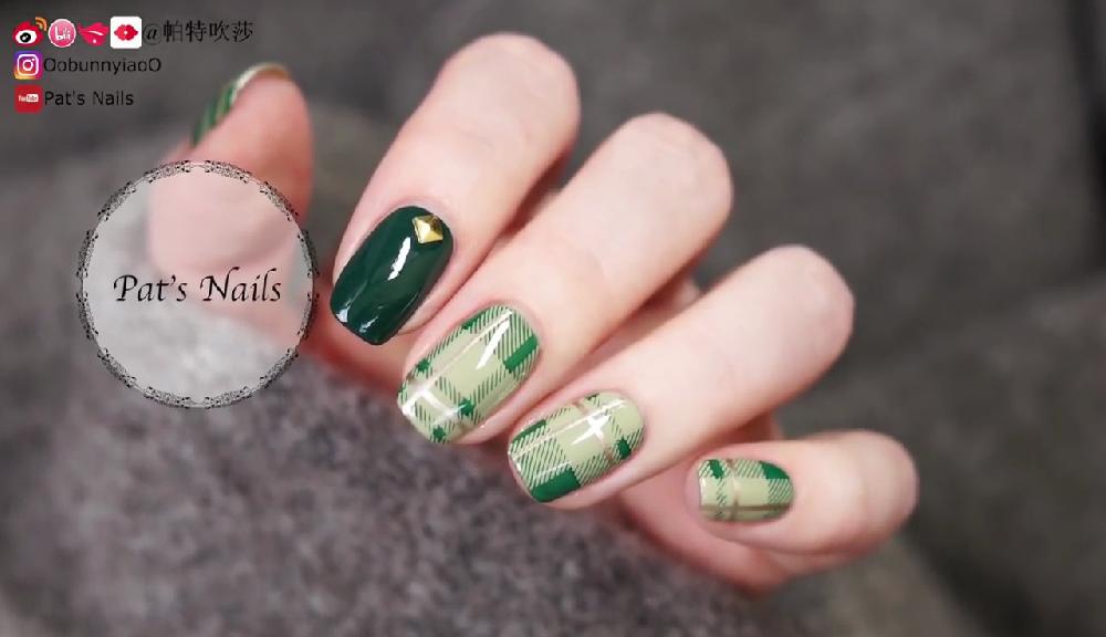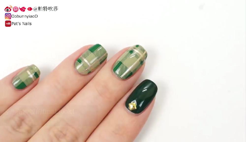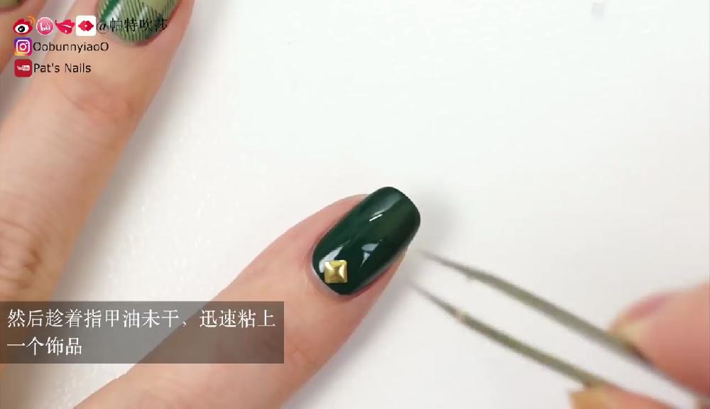這款指甲彩繪主要使用2種顏色,配合簡單的格紋圖案和飾物。