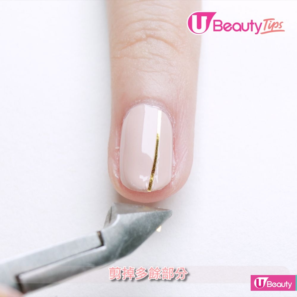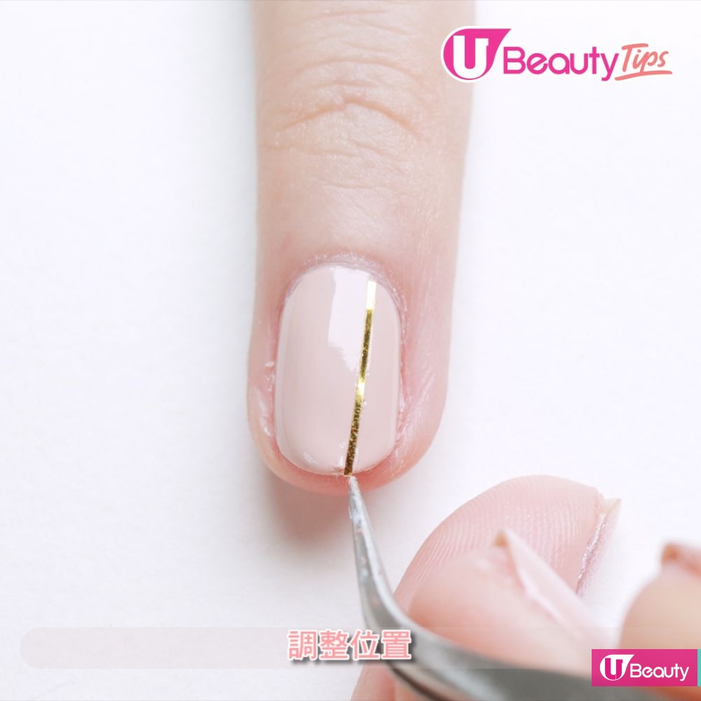 直線條可令手指更修長,先塗全甲,貼上金線條貼紙;在金線條貼紙上加上飾品。