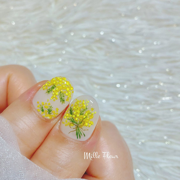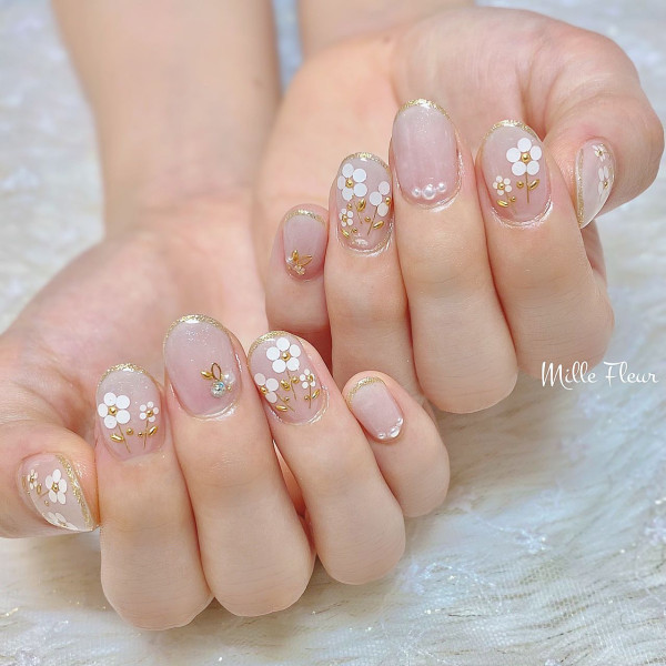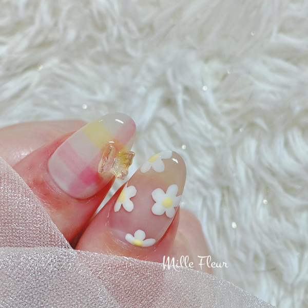 以這1、2年大勢的透明感美甲為基礎,僅以水筆畫形式在指甲面暈染上小雛菊、勾勒出既可愛又優雅的花束,展現獨一無二的彩繪美感,並充滿仙氣與浪漫氣息,喜歡小清新又帶文藝感的彩繪設計,絕對不容錯過!