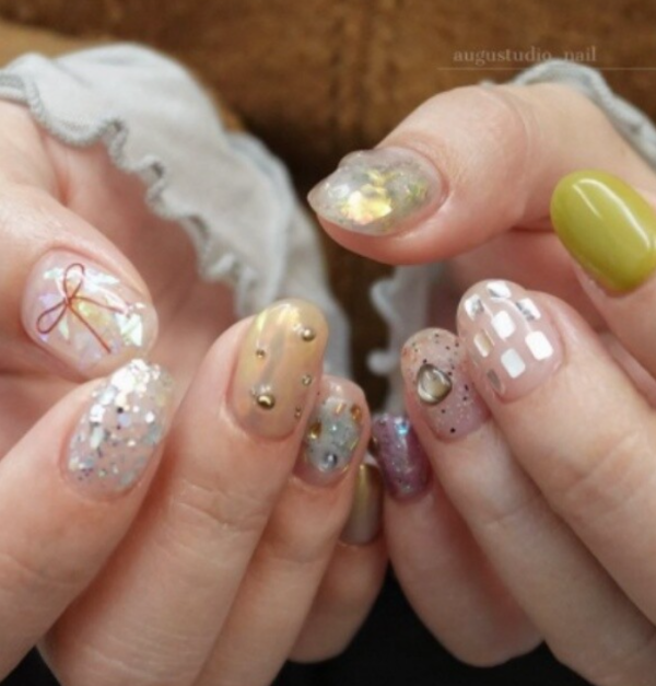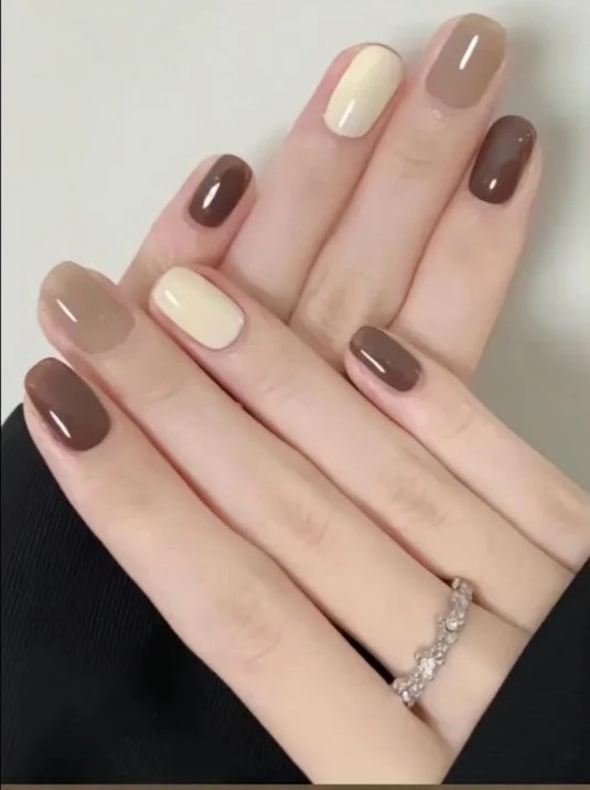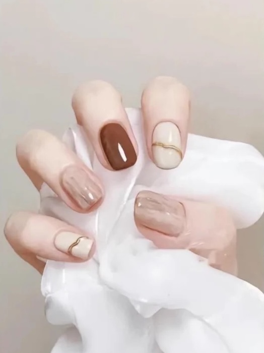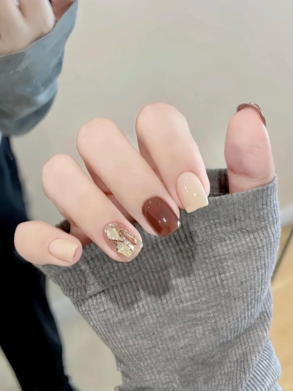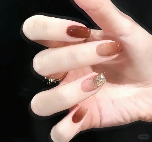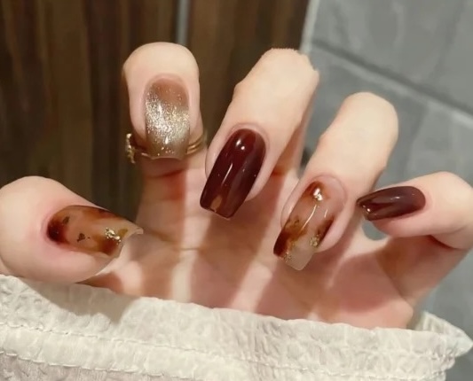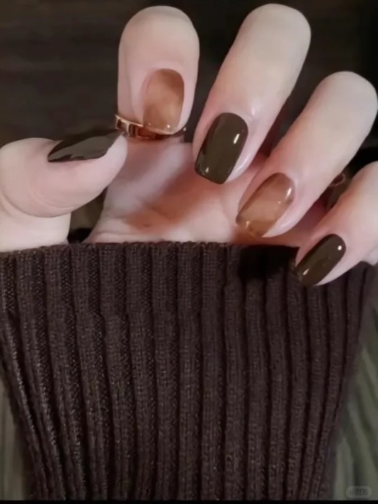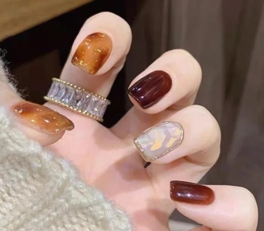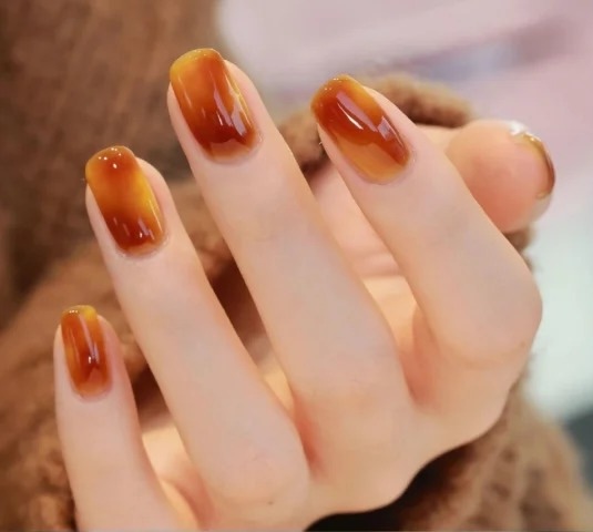 琥珀色調非常適合秋冬季節,無論是簡約風還是華麗風格,琥珀美甲都能讓手指看起來更加修長且膚色顯白,使用金棕和焦糖色的琥珀美甲設計,透過暈染效果讓指尖看起來如琥珀寶石般溫暖,讓指尖散發出溫暖的秋日氛圍。