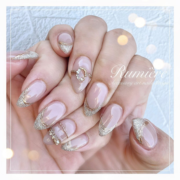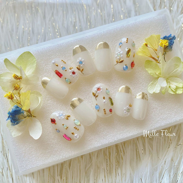 白色給人低調的感覺,如果希望款式更華麗,不妨試試3D 浮雕畫線,搭配鏡面粉及亮片,令設計一下子變得更有存在感。因為是以白色、透明色為底色,以大量金色作點綴也不會太浮誇!