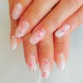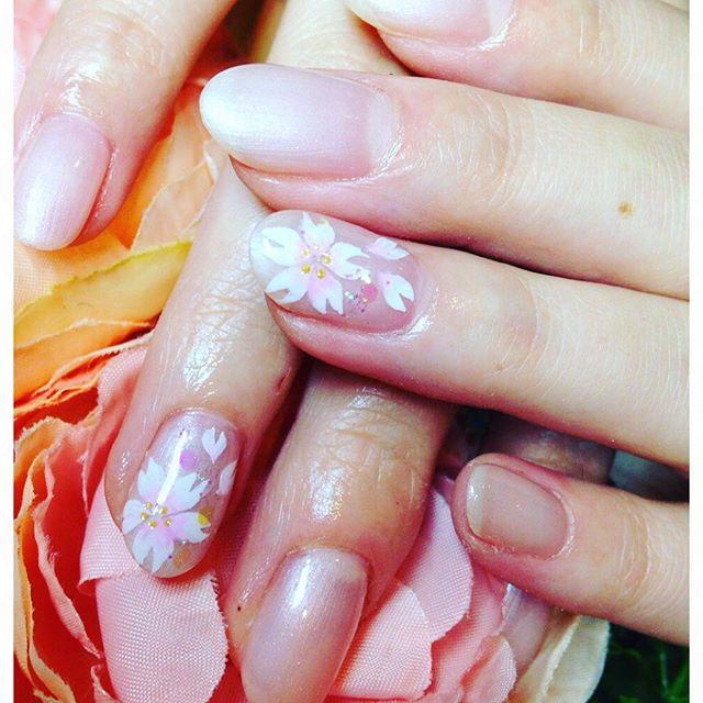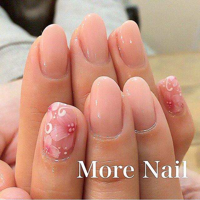 2. 單色指甲為主,只有幾個有櫻花圖案展現大人的可愛,而且桃紅色與膚色融合,非常漂亮。