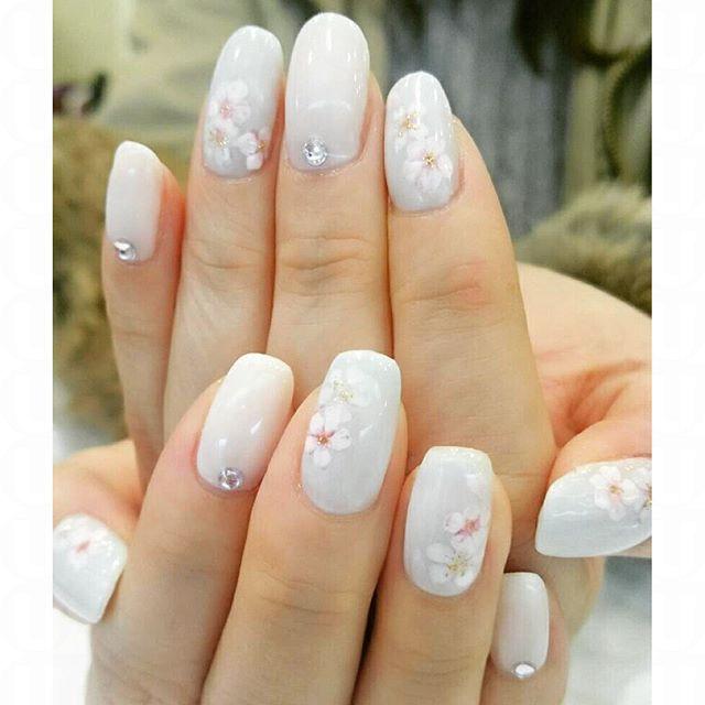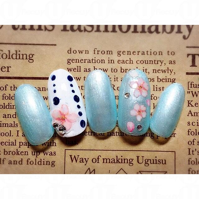 4. 淡藍色的櫻花指甲散發成熟美感,底色配上櫻花的設計充滿日式風格,點綴的水晶更使指甲看起來更時尚。