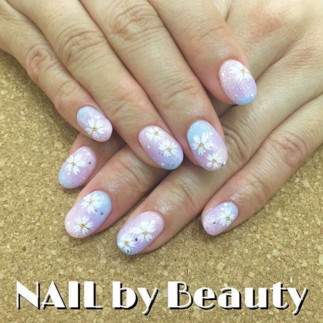 5. 藍色與紫色漸變色的底色使櫻花指甲變得華麗,最適合與樸素的衣服作配搭。