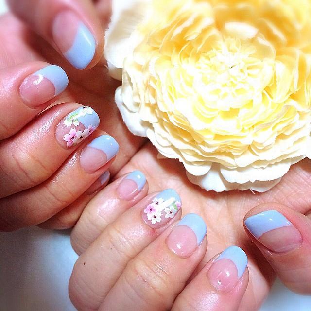 6. 藍色系的法式指甲非常漂亮,不過其實與櫻花也非常合襯,喜歡法式指甲的你不妨嘗試貼上櫻花貼紙,可能會有意想不到的效果!