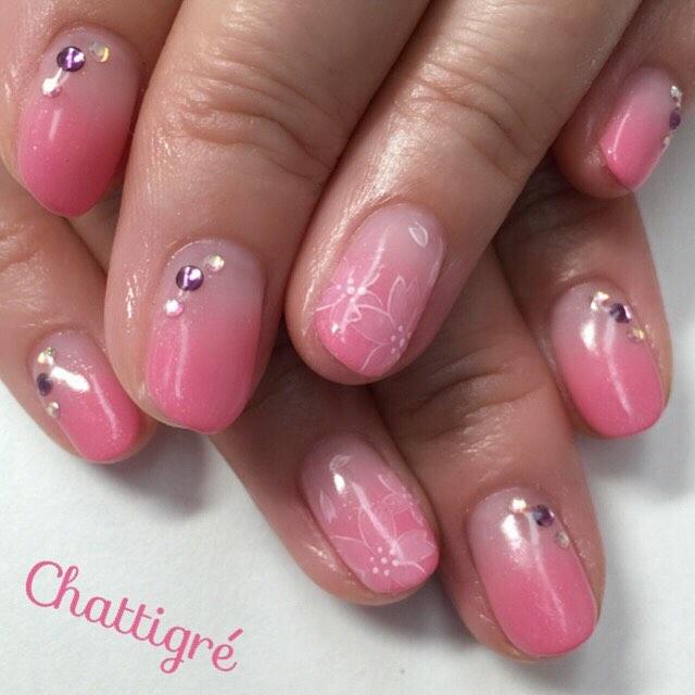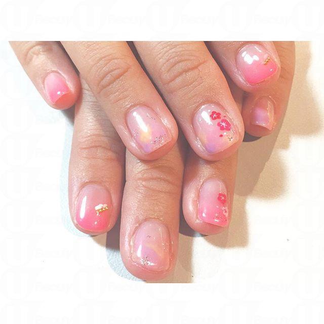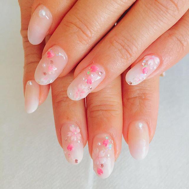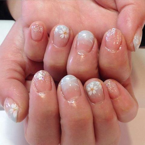 11. 有透明感的漸變色指甲非常漂亮,而且櫻花有綠葉點綴十分可愛,少許的閃石更能提升華麗感。