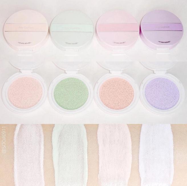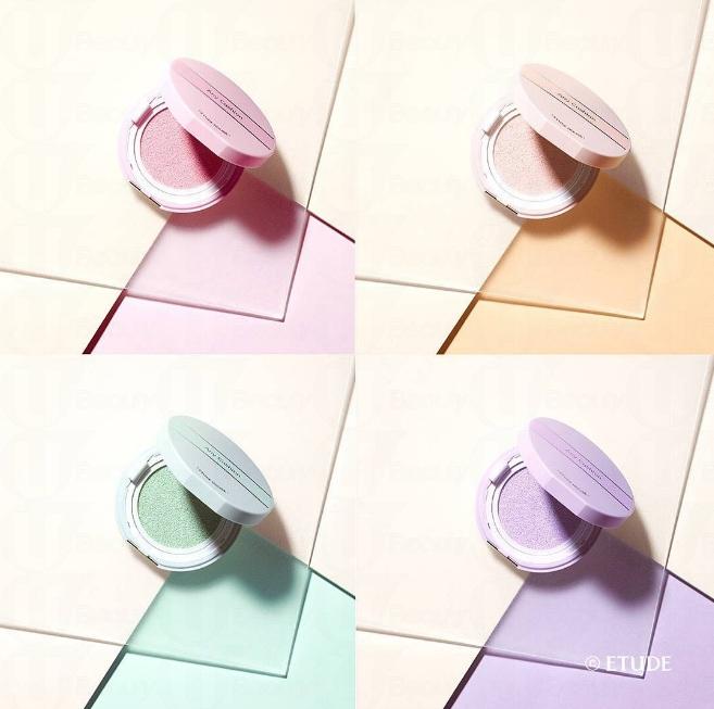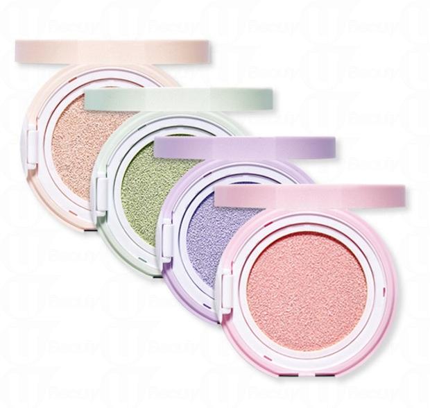 新版的氣墊底霜共推出4色,包括: 紫、粉紅、綠及桃色。每種顏色也有不同的功效,為女生們改善不同的皮膚問題。