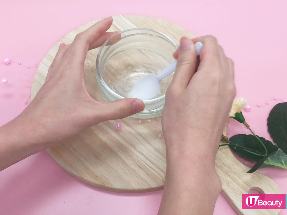 1. 將一匙羹凡士林放在杯內隔熱水加熱,直至融化。(另外可用微波爐或風筒加熱)