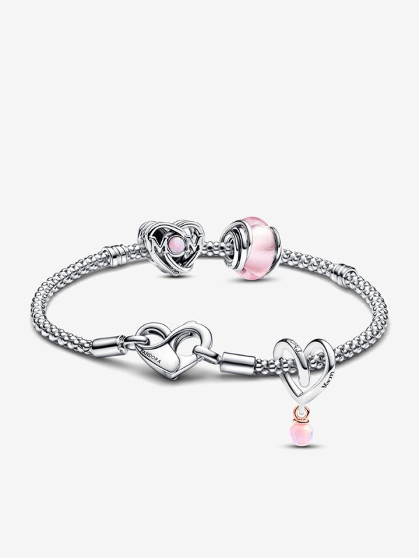 Pandora 為母親節特別推出「There is no one like you」主題串飾及手鏈套裝,以珠寶承載對媽媽獨一無二的愛。這個價值 HK$1,896.00 的套裝,包含一條 Pandora Moments 粒紋 925 銀手鏈,以及三款精心挑選的串飾:母愛鏤空心形 925 銀串飾、雙色金屬(925銀與鍍14k玫瑰金)旋繞心形串飾,和一顆溫潤的粉紅 Murano 琉璃圓環 925 銀串飾 3。這些串飾的材質涵蓋了 925 純銀、鍍 14k 玫瑰金和 Murano 琉璃,設計元素緊扣母愛與心形主題。