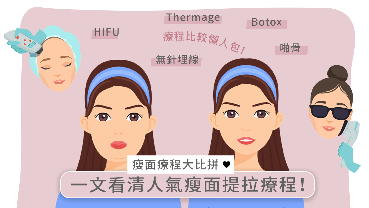市面上有不少美容院都提供瘦面療程,不論是因為肌膚衰老、還是咀嚼肌太發達、骨架大的包包面女生,相信都有考慮過做瘦面療程。HIFU、Thermage射頻、Botox肉毒桿菌、無針埋線、啪骨等時時聽到,但實際上原理、副作用、維持效果時間上又有甚麼分別呢?以下為大家準備好瘦面療程比較懶人包,讓你找出適合自己的瘦面療程,輕鬆獲得V面輪廓!