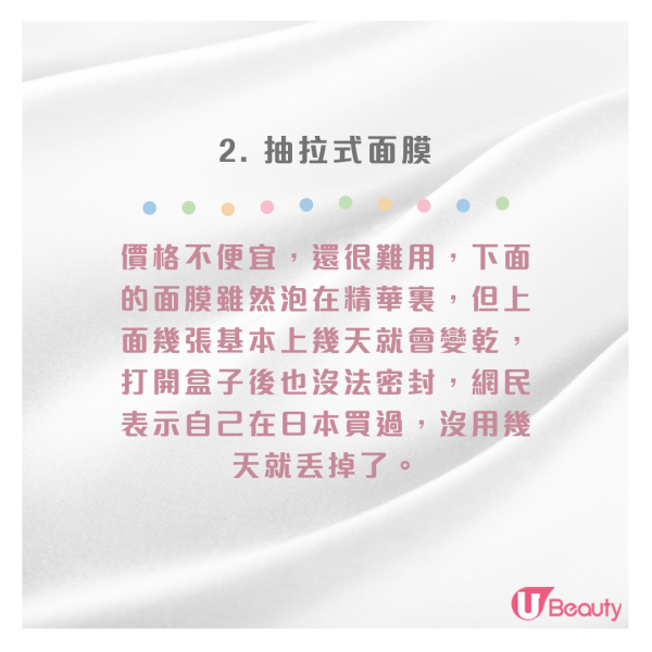 - 抽拉式面膜:價格不便宜,還很難用,下面的面膜雖然泡在精華裏,但上面幾張基本上幾天就會變乾,打開盒子後也沒法密封,網民表示自己在日本買過,沒用幾天就丟掉了。