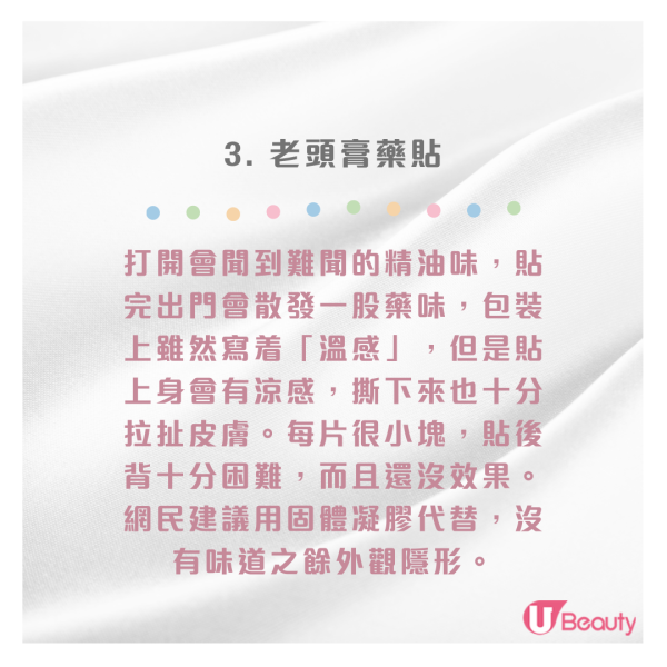 - 老頭膏藥貼:打開會聞到難聞的精油味,貼完出門會散發一股藥味,包裝上雖然寫着「溫感」,但是貼上身上會有涼感。撕下來也十分拉扯皮膚,每片很小塊,貼後背十分困難,而且還沒效果。而且膏藥貼片不太美觀,網民建議用固體凝膠代替,沒有味道之餘外觀隱形。