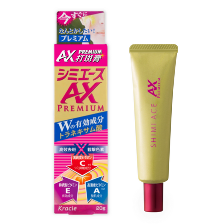 而強效昇級版「Shimiace Premium AX打斑膏」有 #醫美級打斑小金管 稱號,配方除了黃金比例的三重抗氧美白維他命ACE外,更加入醫美級祛斑成分傳明酸!配合Kracie特有CHD高效滲透配方,能夠將去斑成分快速滲入肌膚底層,主動追擊誘發黑色素生成的因子,於色斑形成之前已經徹底擊碎黑色素。有效排出x抑制x預防黑色素!