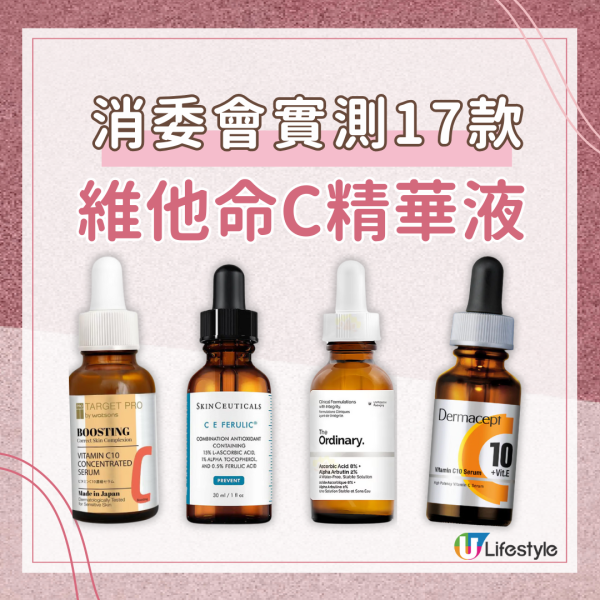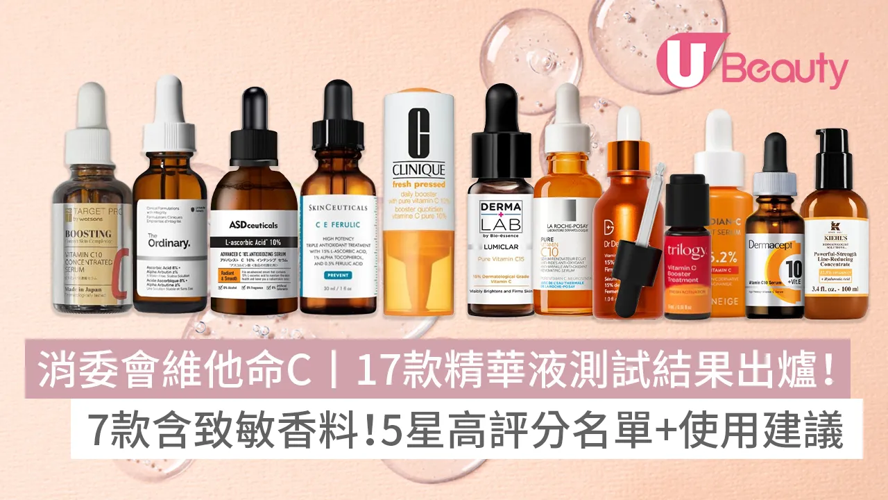 消委會維他命C護膚品測試丨消委會曾檢測市面上17款維他命C精華美容液,當中有1款沒有檢測出維他命C,10款實際檢測結果低於標示濃度。而17款樣本中有4款奪5星高分,維他命C濃度含量理想,當中1款僅售$101。