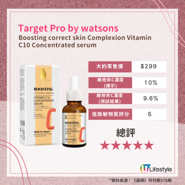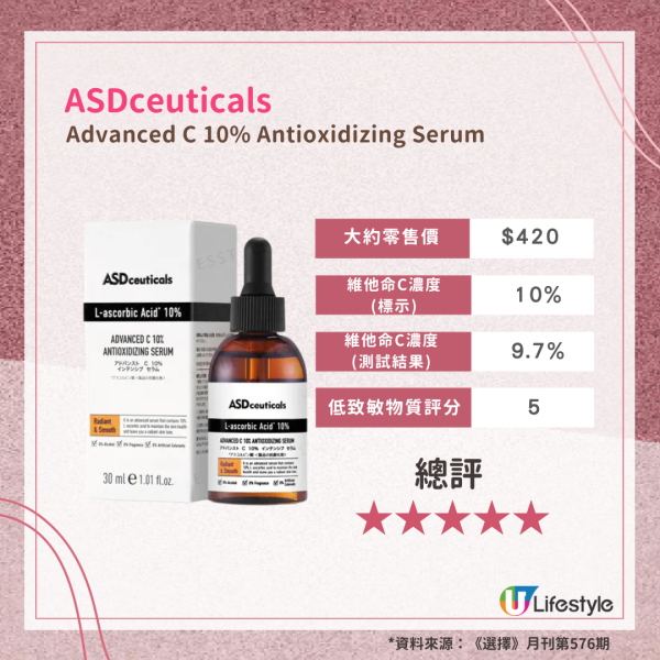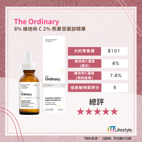是次檢測的17款樣本中,有4款奪5星高分,分別是Target Pro by watsons的「Boosting correct skin Complexion Vitamin C10 Concentrated serum」、The Ordinary的「8% 維他命C 2%熊果苷面部精華」、ASDceuticals的「Advanced C10% Antioxidizing Serum」以及Skinceuticals的「濃縮維他命 CE FERULIC精華 CE FERULIC」。上述4款維他命C精華液及美容液的維他命C濃度真實含量與其產品濃度標示差異僅在-2%至-0.4%之間,亦不含香料致敏物質。當中The Ordinary的「8% 維他命C 2%熊果苷面部精華」僅售$101(見莎莎網店售$92),為性價比之選。