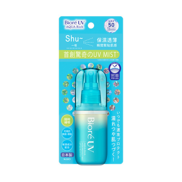 Biore | 含水防曬水珠噴霧 (UV Aqua Rich Aqua Protect Mist) | 水感防曬、方便補噴、清爽不黏膩 | ★★★★★ |