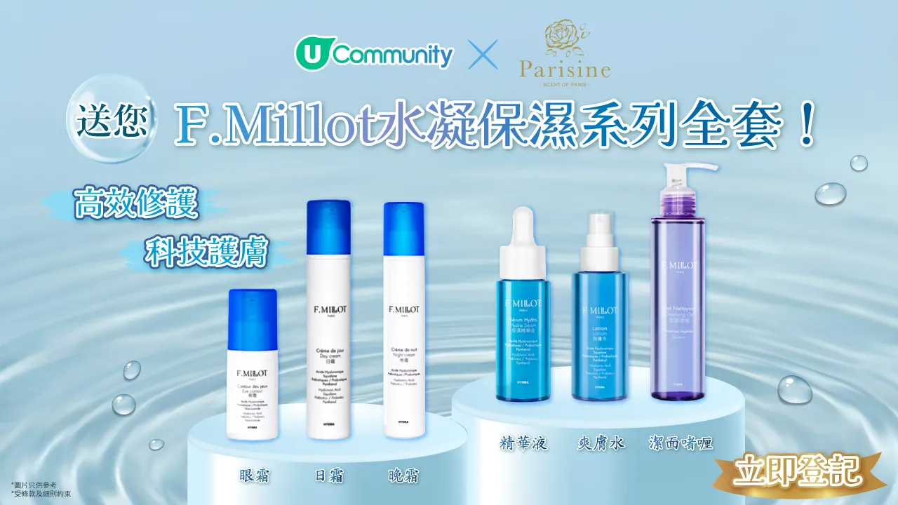 拒絕繁複護膚步驟,體驗法式精簡美學!U Community社群X法國品牌Parisine送出全套F.Millot水凝保濕護膚套裝!從潔淨、保濕到修護,簡潔嘅護膚步驟為肌膚提供適度保護,將角鯊烷及益生元等高濃度成分注入肌底,持續使用有助恢復維持皮膚水脂平衡✨!