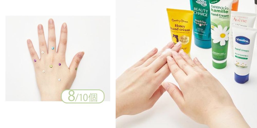 使用感:在塗抹了護手霜的手背上,查看紋理變化及延展性。之後,利用亮片及外力震動手背來測試粘膩度,亮片數量愈少得分越高。