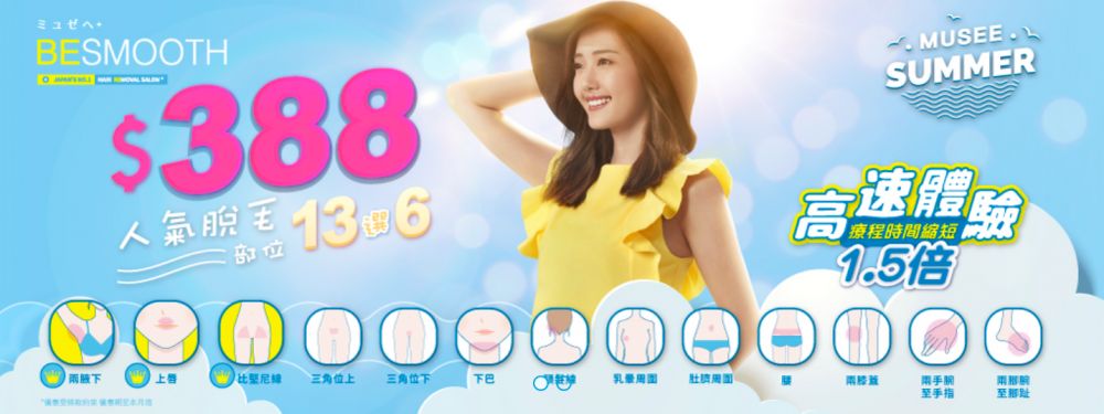 MUSEE正進行夏日限定優惠,HK$365便能一年任脫兩腋下,而HK$388便能選擇6個部位進行療程。有興趣的女生可到MUSEE官網了解其他療程的詳細價錢。