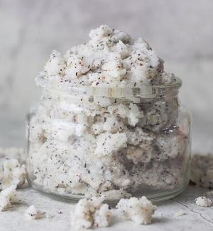 如果擔心鹽會刺激皮膚,用白砂糖會溫和一點。將糖和椰子油以4:3的比例混和, 因糖較易溶化成圓顆狀,可輕輕磨去死皮。而天然的椰子油可清潔皮膚,又有潤膚護膚的作用。大家亦可按肌膚需要,加入不同的材料,提升美容功效。如加入搗碎的茶葉,有抗衰老和抑制黑色素的效用。而加少量薰衣草有助控制皮脂分泌。