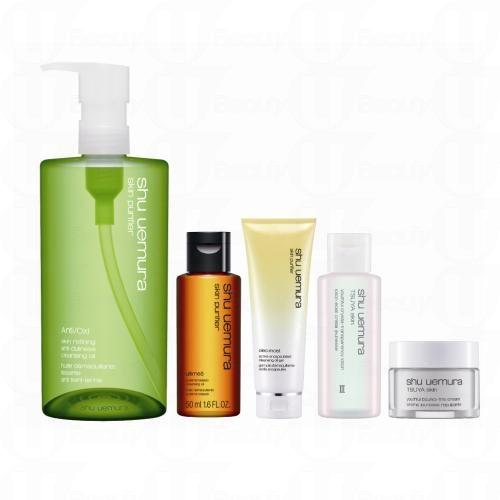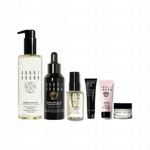 套裝包括:皇牌產品紓緩卸妝潔面油200ml + 任何粉底液 + 紓緩卸妝潔面油30ml + CC Cream 5ml + 膠原活膚保濕面膜7ml + 水盈礦物保濕面霜7ml