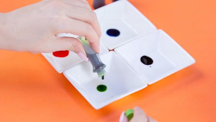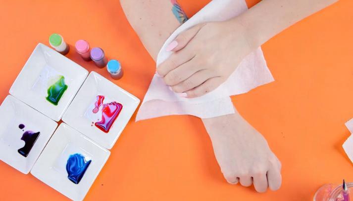 3. 將食用色素倒出,待皮膚上的圖案乾掉後,用化妝掃將顏色隨意塗上,每塗一層就用一張乾淨的紙巾輕輕印乾。
