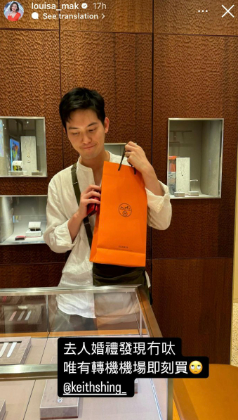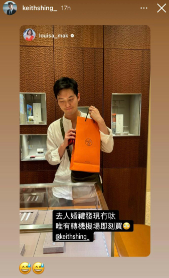Louisa同老公的吸金能力一向驚人,之前更大晒價值6位數的愛馬仕手袋Mini Lindy去海洋公園玩,今次去英國參加婚禮期間因為老公在離境後才發覺忘記帶領帶,所以便趁轉機期間入愛馬仕買,更把插曲分享到限時動態並配文更加入反白眼emoji「去人婚禮發現冇呔,唯有轉機機場即刻買🙄」,Keith都轉發了這則限時動態並以「😅😅」兩個emoji回應,網民都笑稱「勁甜麥又放閃!」