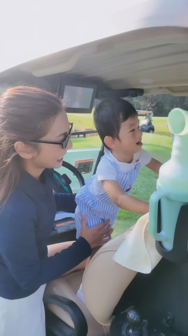 何雁詩除了熱愛唱歌和演戲,還非常喜歡打高爾夫球。最近,她在社交平台上分享了一段自己打高爾夫的影片,身著專業的高爾夫服裝出現在球場上。她還帶著兒子Asher一起到場,將他放在胸前揮桿的同時,兒子則坐在草地上的小椅子上。這樣的情況引起了不少網友的關注,大家都擔心這樣會不會有危險,擔心小孩可能會被高爾夫球或球桿意外擊中。
