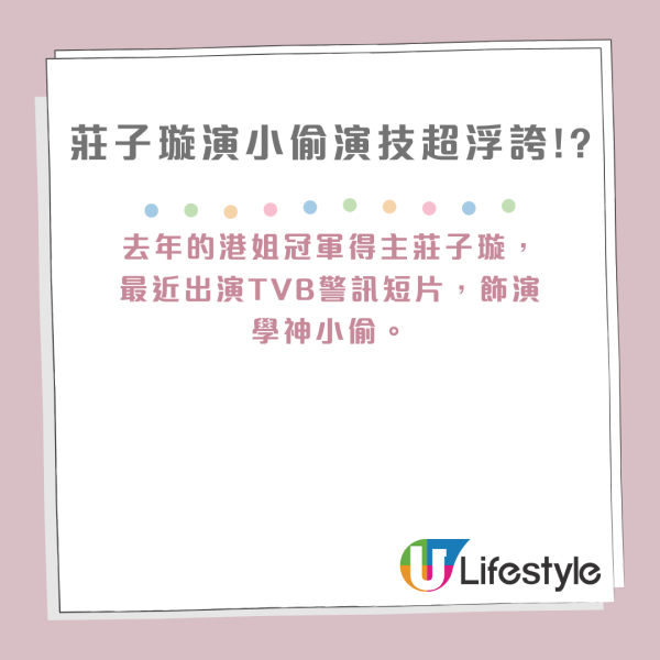 去年港姐冠軍得主莊子璇(Hilary),最近出演TVB警訊短片,在片中與李君妍一同飾演學神小偷,學做爆格之王,藉此推廣防罪防騙資訊。有網民就在影片留言,驚呼Hilary撞樣黃心穎!
