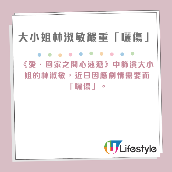 林淑敏憑《愛.回家之開心速遞》以大小姐一角深入民心,她近日因應劇情需要而「曬傷」,引致面部多處爛面,更是有嚴重紅腫和甩皮。大小姐剛好在化妝間遇到劇中飾演律師「Minnie」一角的邵初,邵初見到大小姐臉上的嚴重傷勢,頓時被嚇得不知所措,更是原地直接爆哭!?