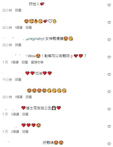 性感的靚相吸引一眾網民在文中留言大讚「完美Regina😍」、「超級美 我俾你💯✌️」、「好靚女呀♥️♥️」、「好高貴優雅❤️」、「什麼公主從城堡裡跑出來了!!」、「是不是拍性感廣告❤️」、「迪士尼在逃公主👸🏻❤️」。