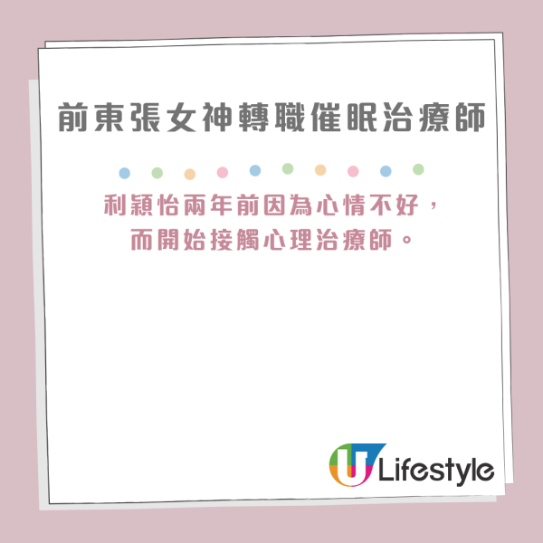 37歲的利穎怡因主持《東張西望》成為「東張女神」之一,在2022年離開節目後,便專注在演員路線發展,在今年7月正式結束與TVB長達12年賓主關係,過檔HOT TV任主持。早前,利穎怡在社交平台公佈自己已成為註冊催眠治療師,更大爆離巢前的辛酸。